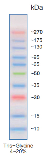 | 产品介绍 | 产品简介: 本产品由跨度从10 ~270 kDa的10种纯化的天然蛋白混合而成,各条带浓度约为0.1~0.5 mg/ml。其中30 kDa和270 kDa条带为加强条带,方便判断各个条带的准确位置。本产品适合作为SDS-PAGE电泳时,变性蛋白样品的分子量参照,并可实时观察蛋白样品的电泳分离状况,也可用于检测Western blot的转膜效率。由于共价结合的染料会影响蛋白质分子的电泳迁移率,本产品仅适于粗略地估计目的蛋白样品的分子量。 使用说明: 1. 将本产品于室温融化后,轻轻混匀,使沉淀充分溶解。 2. 上样5ul,SDS-PAGE电泳过程及转膜后可看见清晰的彩色条带。 3. 建议依据待测蛋白分子量选择合适的分离胶浓度。 注意事项: 1. 使用时应该将从低温取出后的产品恢复至室温后混匀,然后再上样,否则可能由于低温下蛋白变性不彻底导致电泳条带出现不同程度的弥散或拖带。 2. 转膜效果与转膜时间有关,需根据客户目的条带大小而定,如果转膜后较大分子量条带有部分未转膜成功,属于正常现象。 3. 本产品含有SDS,蛋白已变性,不宜作为天然蛋白分子电泳时的分子量参照标准。 |